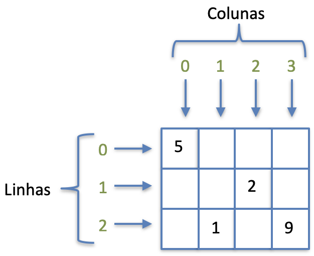 A lógica de acesso segue semelhante a forma de acesso a um vetor, com os índices de linhas e colunas começando em 0: